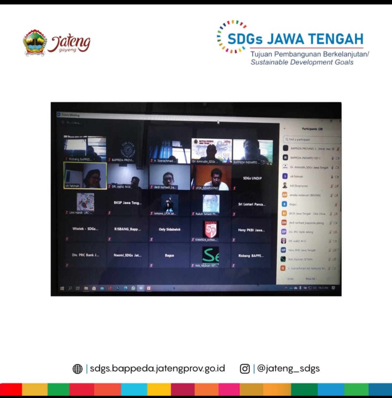 FGD dihadiri unsur pelaku usaha (Ketua APINDO, Kadin Jateng, Bank Jateng, PT Telkom, Dewan Koperasi Jawa Tengah, BKSP); unsur filantropi (Budi Santoso Foundation, Badan Amil Zakat Nasional); unsur OMS (LSM Pattiro, Rumah AIRA, PKBI Jateng, LRC-KJ HAM, LP2K, SPSI Jateng, Bina Karta Lestari, Walhi, LBH Jateng); unsur kampus (SDGs Center UNDIP, LPPM Unika, sejumlah pakar Prof. dr. Fatimah Muis M.Sc, Ahmad Kurnia Zakir PhD, Rukurh Setiadi PhD, Hotmauli Sidabalok SH MH), dan unsur pemerintah (Kabid dan pejabat fungsional Bappeda Prov. Jateng).